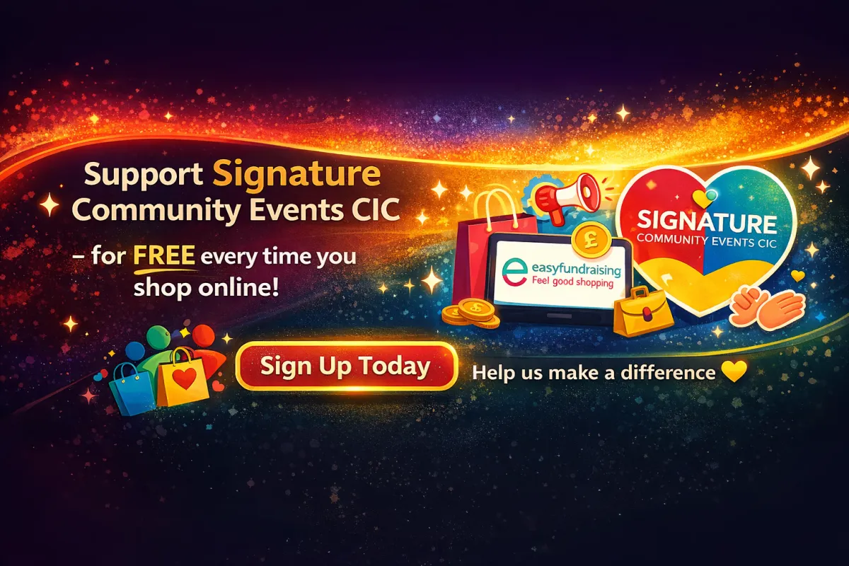 Every supporter helps us deliver free community activities, training, and events. By simply signing up and shopping online, retailers donate to Signature Community Events CIC at no extra cost to you β helping us remove financial barriers and make our work accessible to everyone in the community.